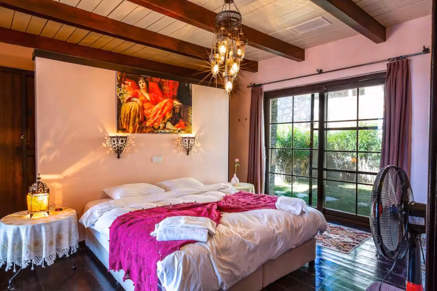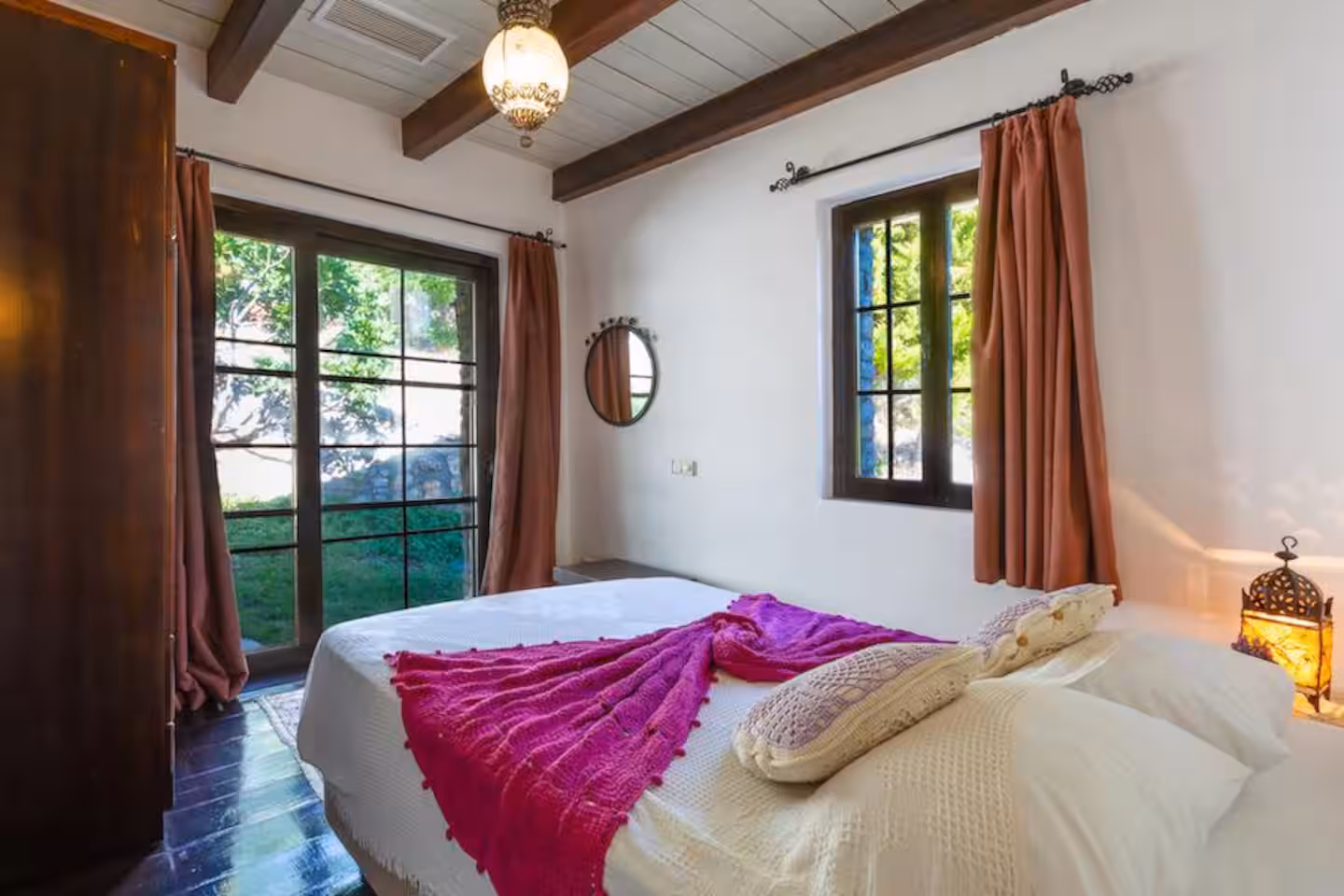 This spacious master suite features soaring wooden beam ceilings, elegant blue curtains, and vibrant Turkish artwork. The room opens directly onto the lush gardens through French doors, creating a seamless indoor-outdoor flow.
