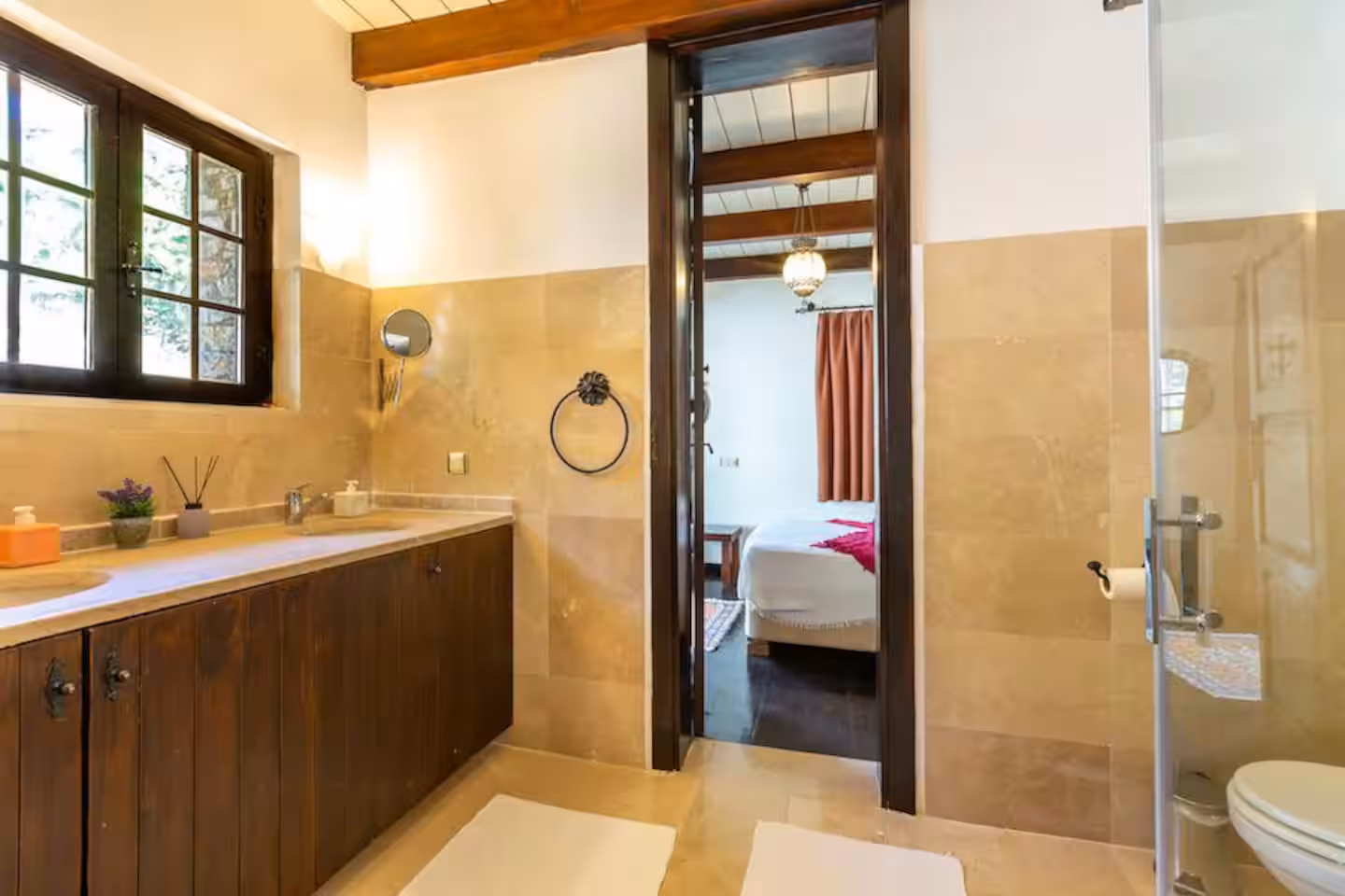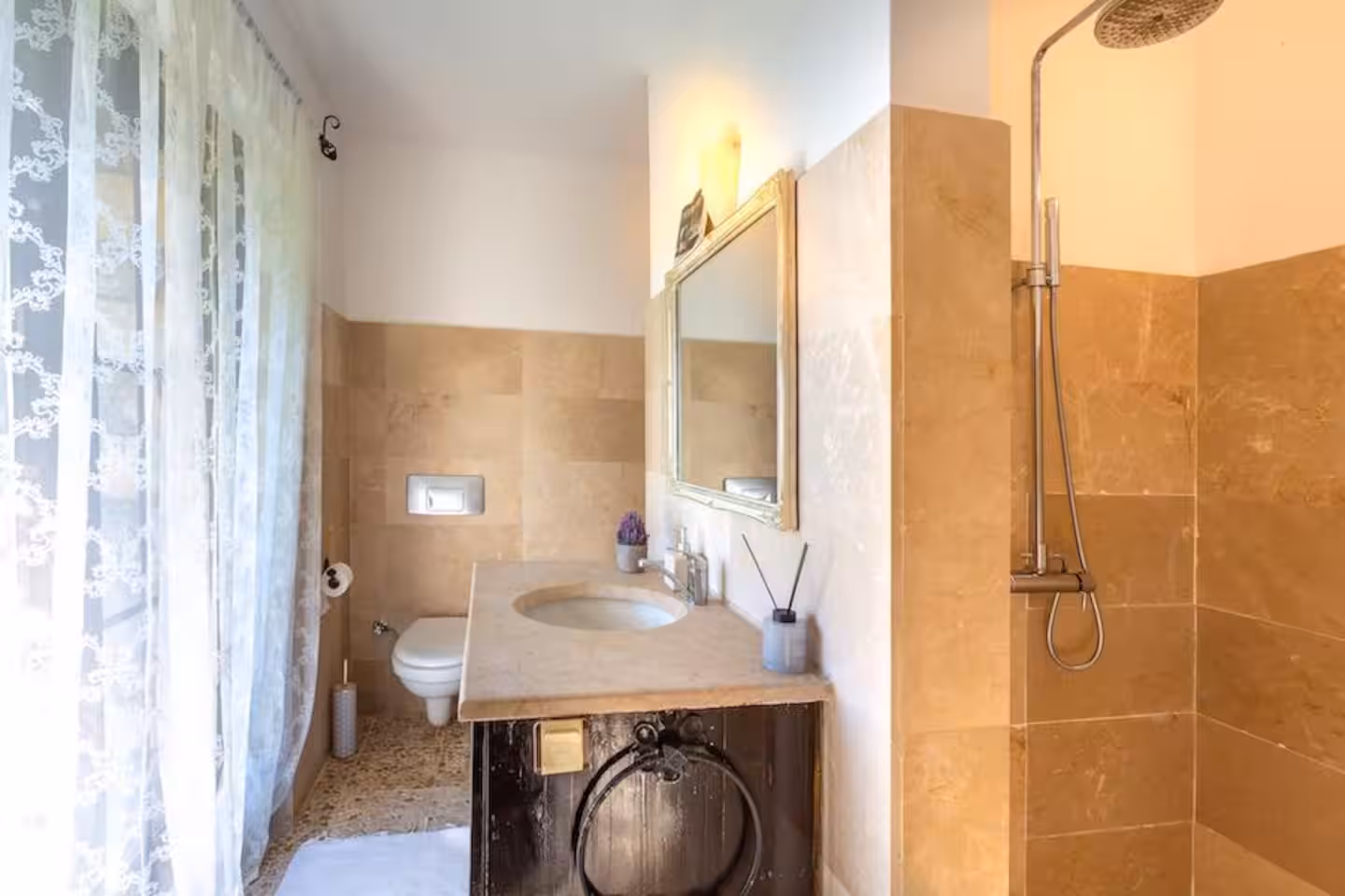 Three luxurious en-suite bathrooms plus a guest toilet ensure comfort and privacy for all guests. Finished in warm beige marble with modern fixtures, walk-in showers, and elegant lighting, each bathroom maintains the villa's signature blend of traditional Turkish style and contemporary luxury.